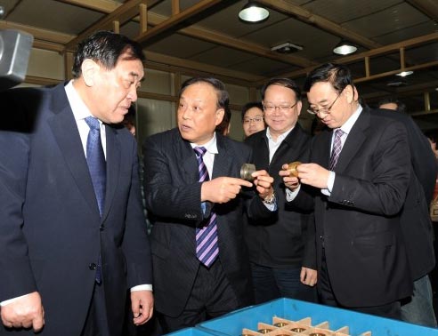 會議期間,中國紡織工業(yè)聯(lián)合會會長王天凱(左一),副會長高勇(右二)、徐文英(右一)到同和紡織機(jī)械制造有限公司調(diào)研,聽取董事長崔桂生介紹新產(chǎn)品。